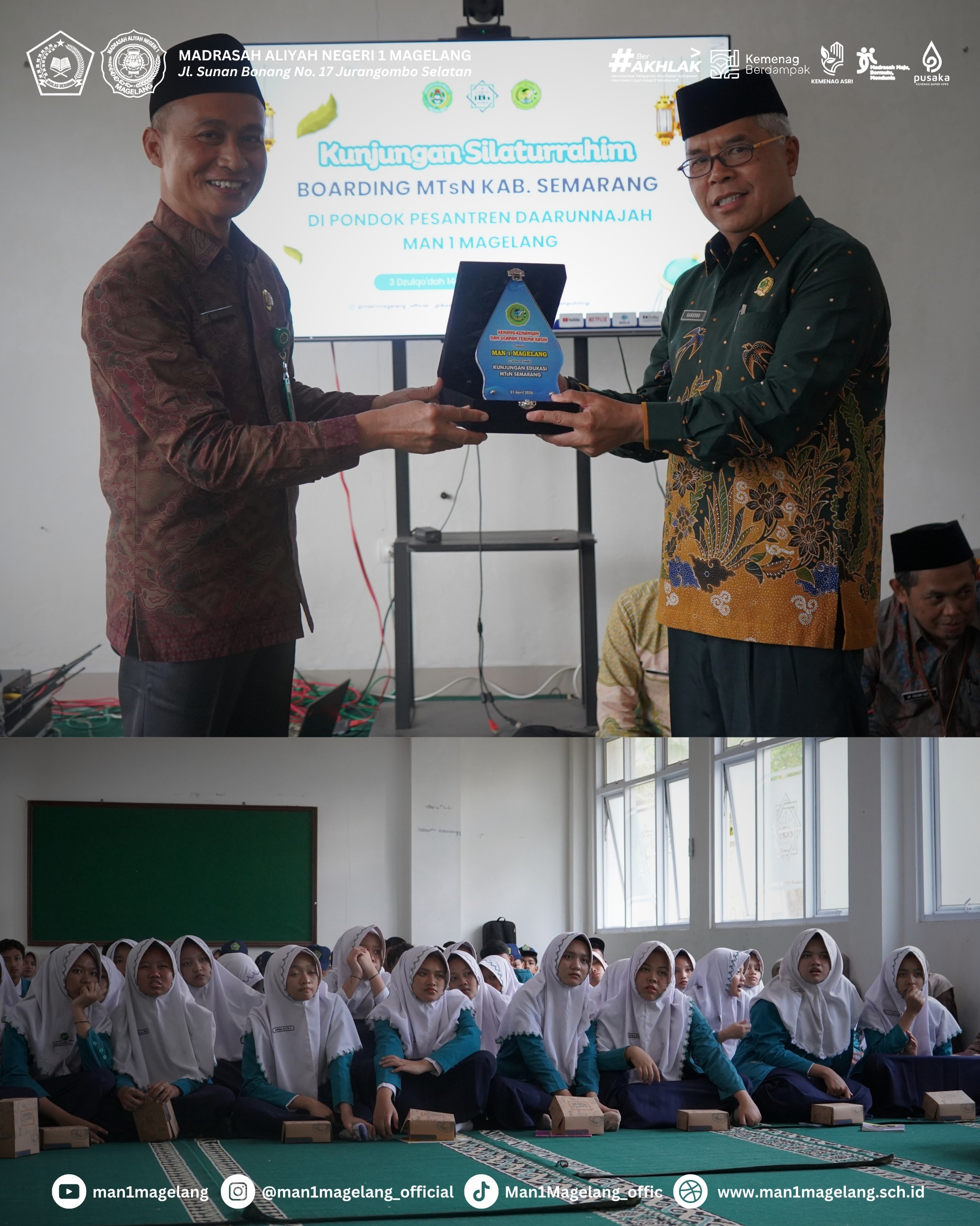 MAGELANG – MTs Negeri Semarang melaksanakan kunjungan silaturahmi ke Pondok Pesantren Daarunnajah MAN 1 Magelang pada Selasa (21/04/2026). Kunjungan ini bertujuan untuk mempererat hubungan antar madrasah sekaligus berbagi pengalaman dalam pengembangan pendidikan berbasis pesantren.