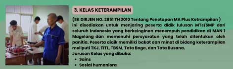 (SK Dirjen NO 2851 Tahun 2010 Tentang Penetapan MA Plus Keterampilan) ini disediakan untuk menjaring peserta didik lulusan MTs/SMP dari seluruh Indonesia yang berkeinginan menempuh pendidikan di MAN 1 Magelang dan memenuhi persyaratan yang telah ditentukan oleh panitia. Peserta didik memiliki bakat dan minat di bidang keterampilan meliputi TKJ, TITL, TBSM, Tata Boga dan Tata Busa.
